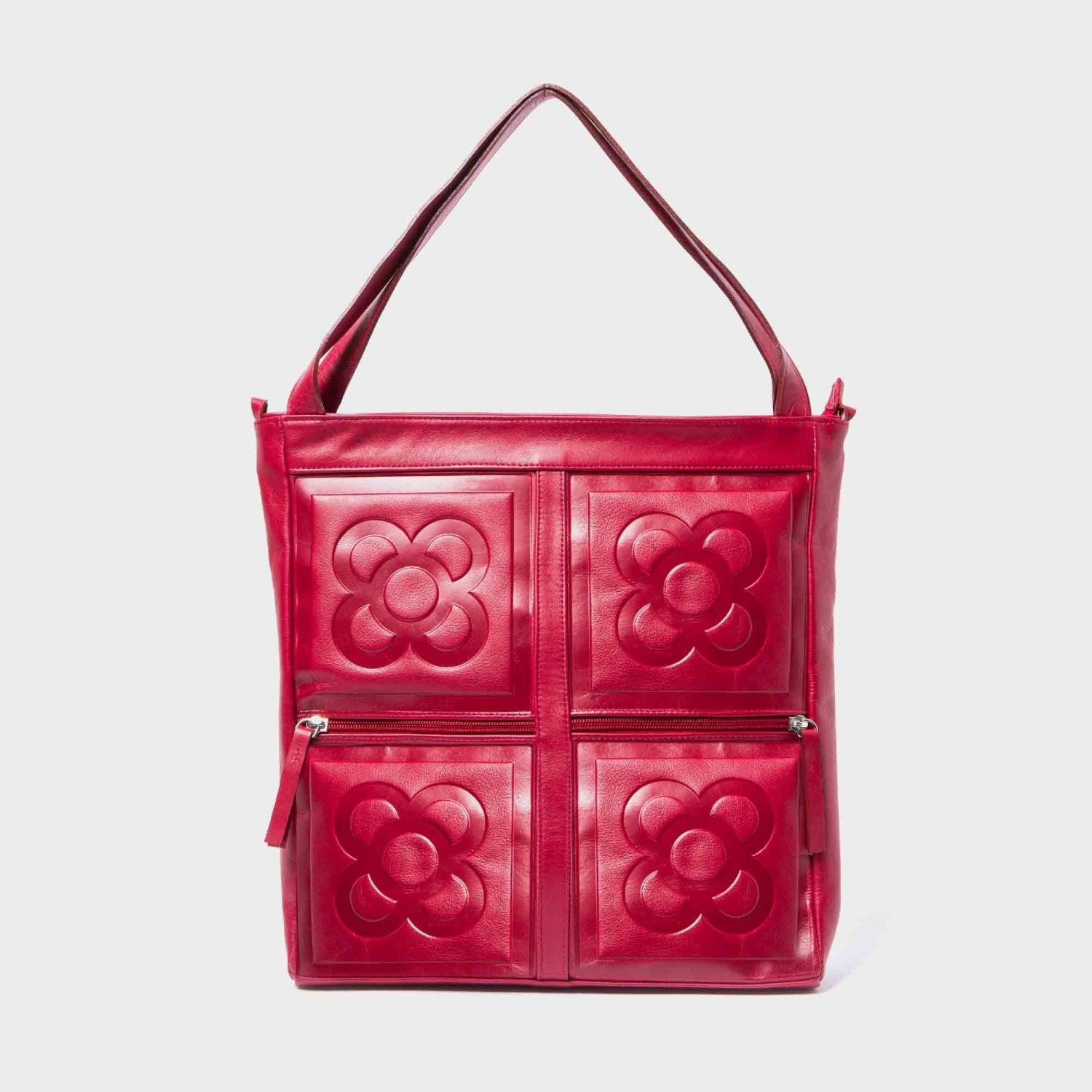 Bossa de pell shopper en forma de cub gravada amb el panot de flor a la part frontal.